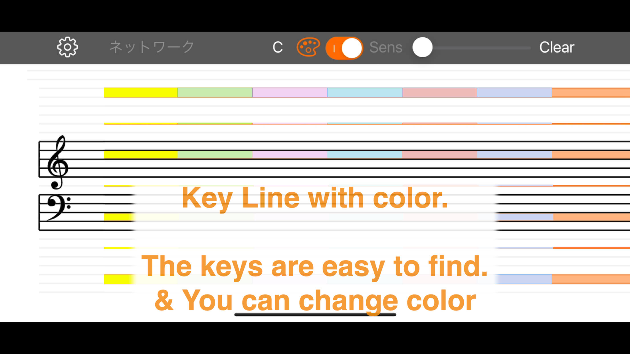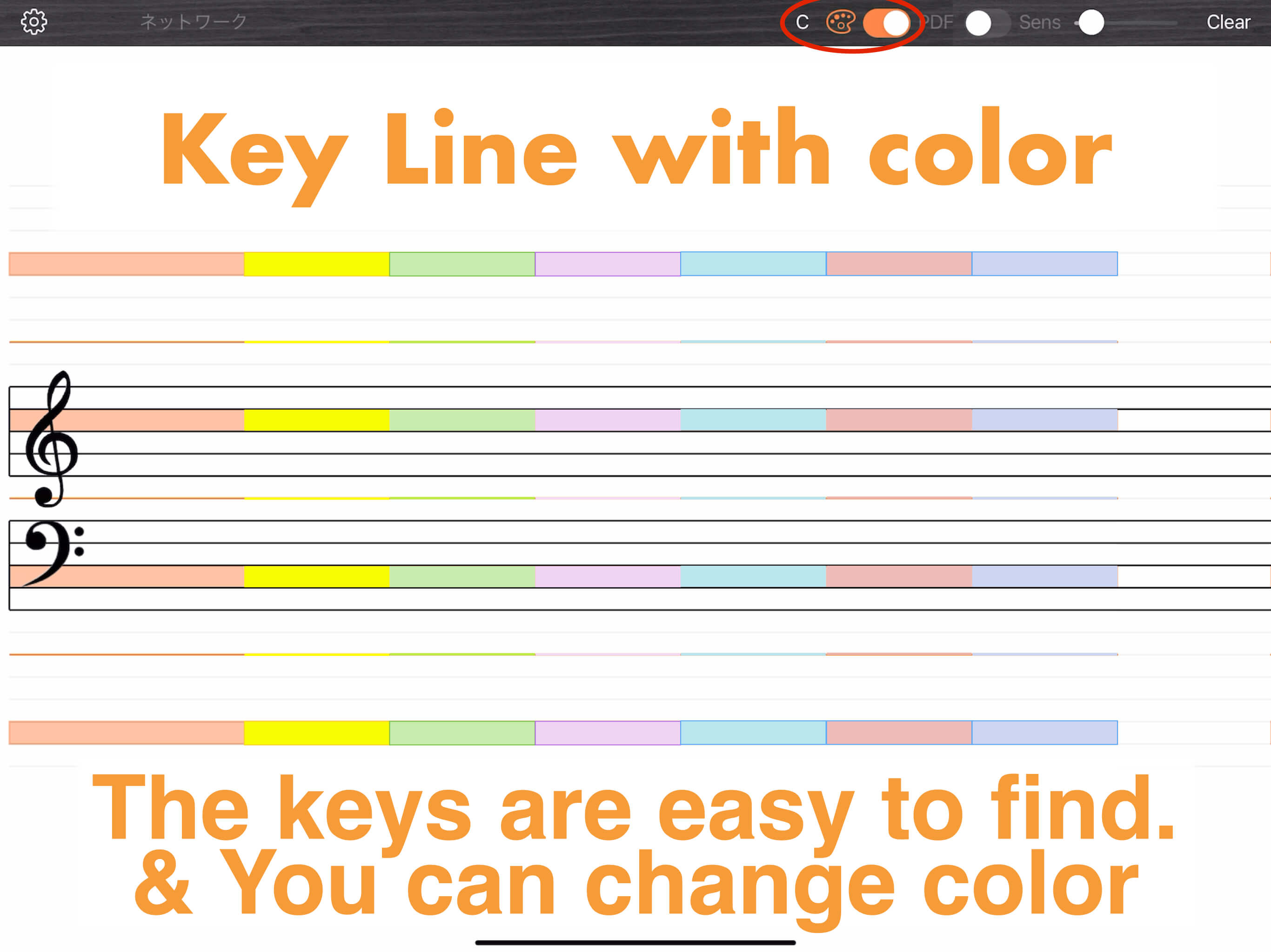 You can also mark the C positions on the staff. This helps you know where to move your hands as soon as you look at the sheet music. The mark colors can be customized.