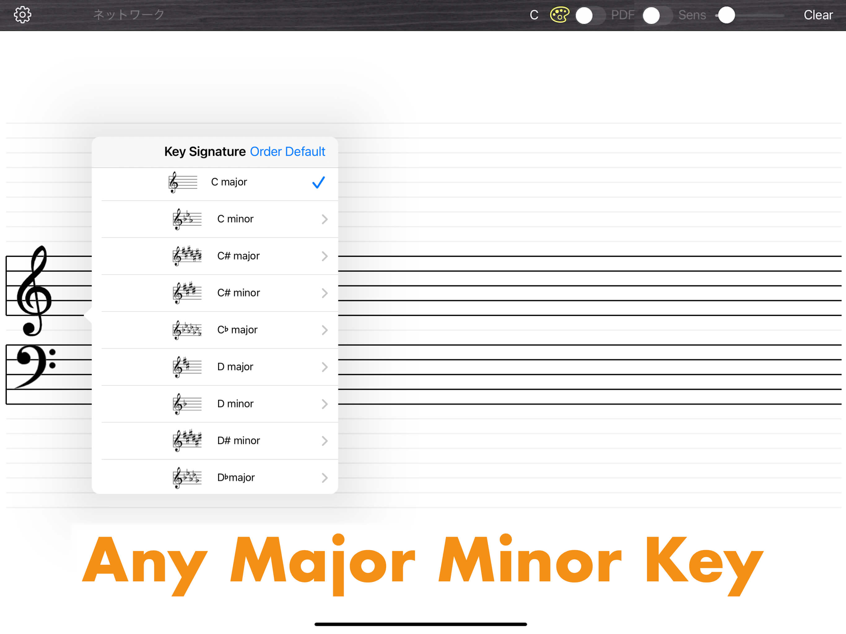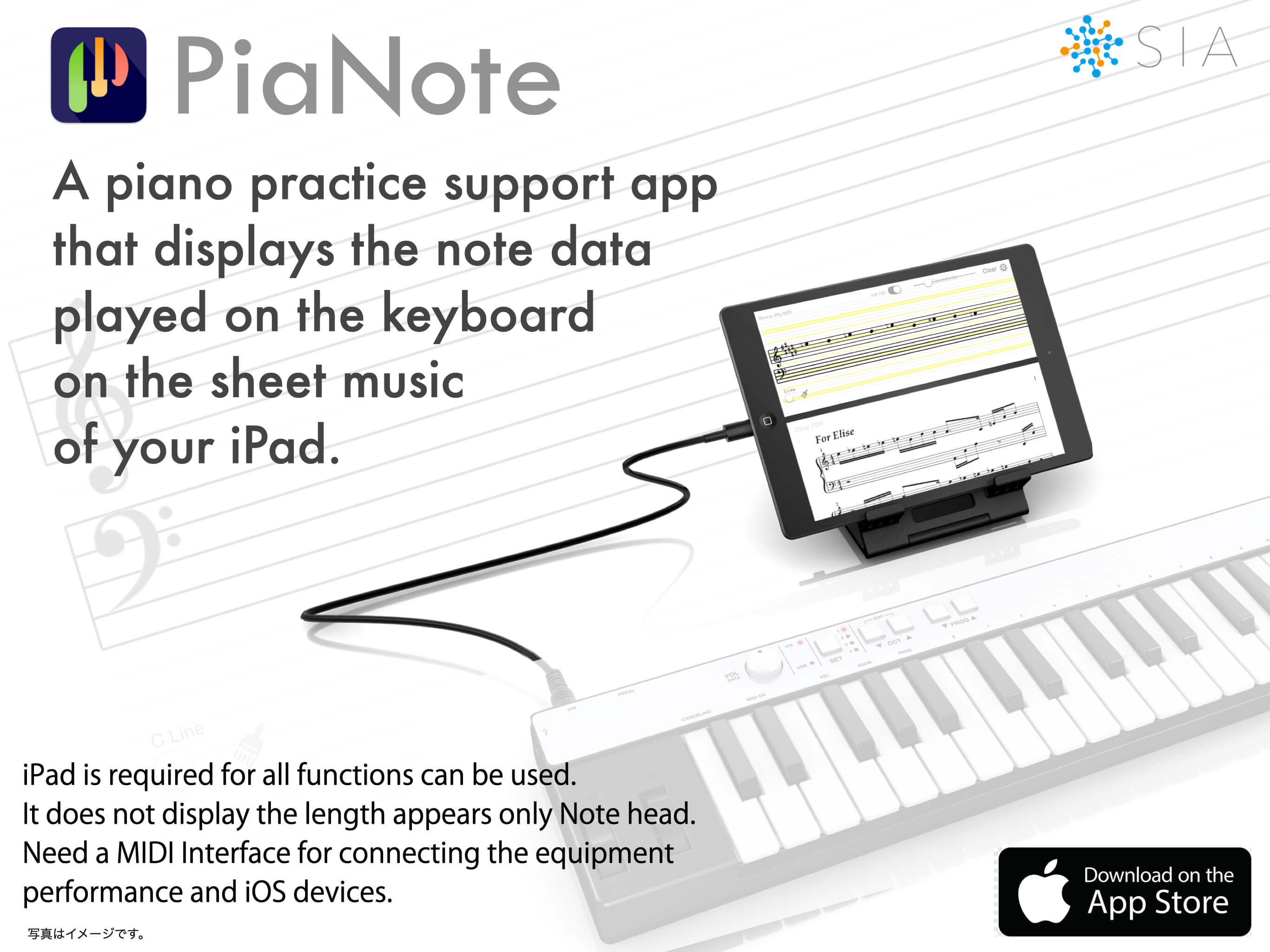 This app displays sheet music corresponding to the keys you play by connecting to pianos, digital pianos, keyboards, synthesizers, etc. with MIDI OUT terminals.