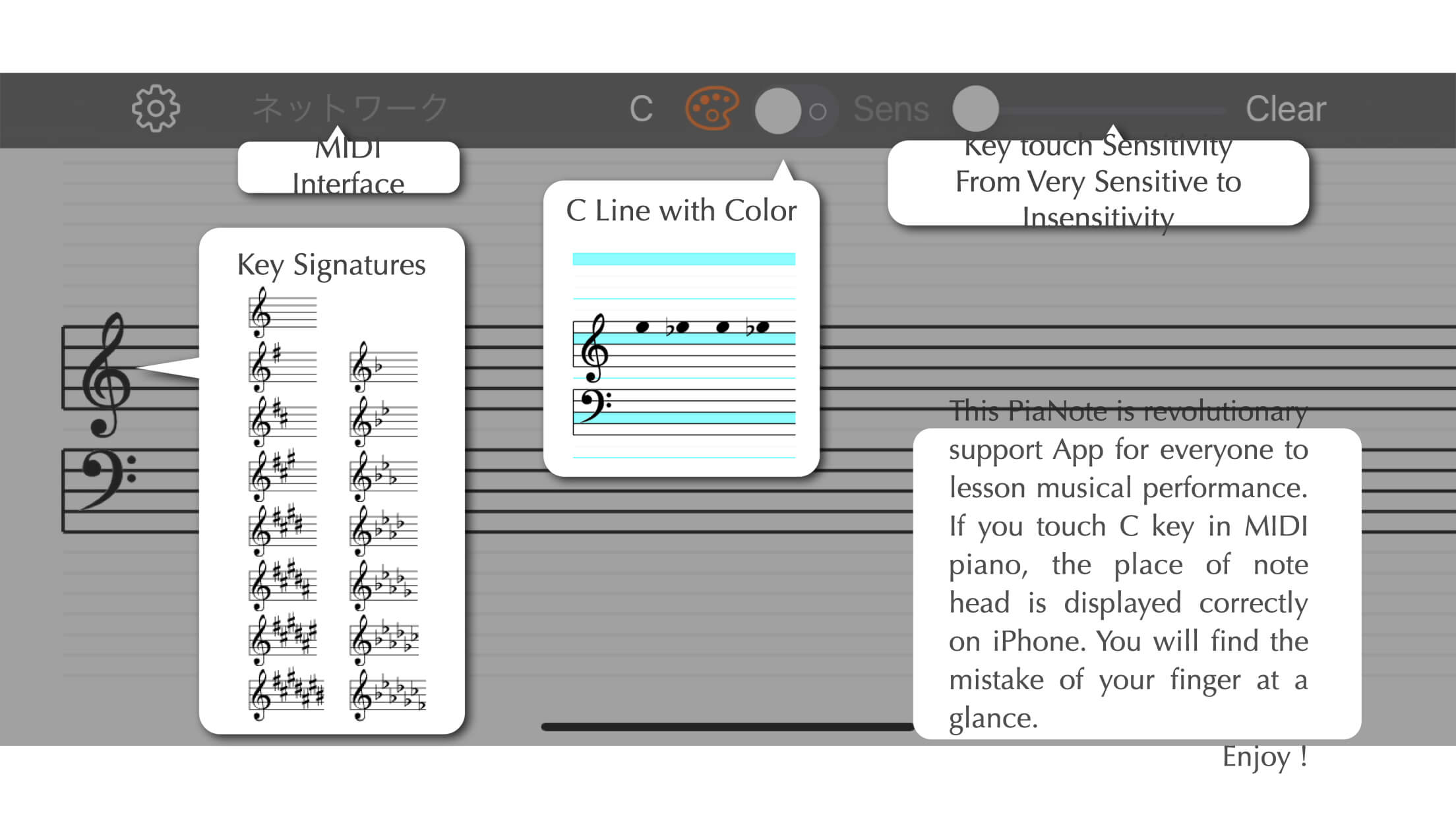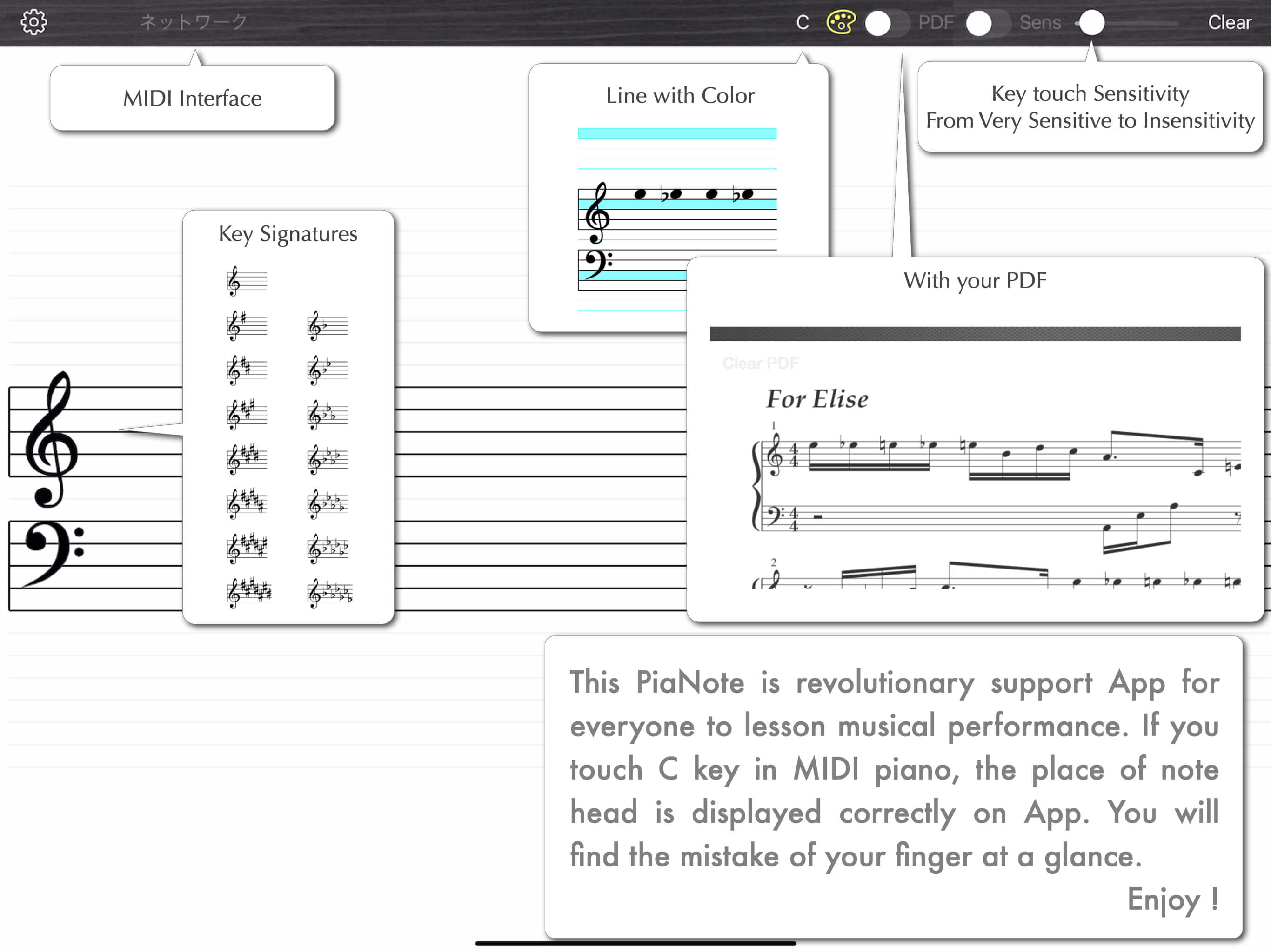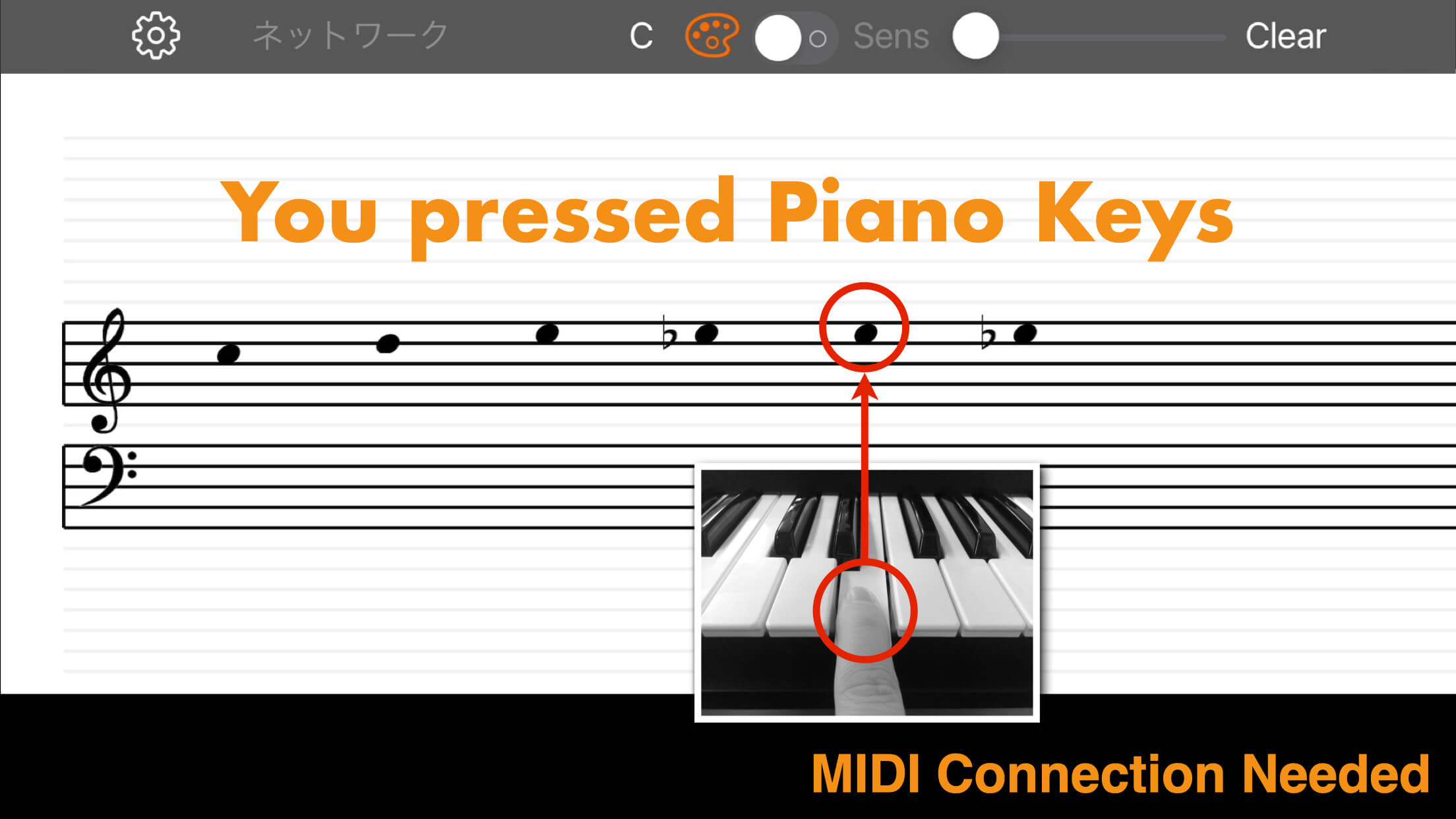 When you press C on the piano, a note appears at that position on your iPad (or iPhone). You can instantly see if the note you played differs from the one in the sheet music.