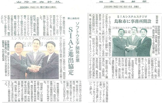 ホーム/お知らせ/調印式に関する記事が、日本海新聞、山陰中央新報、朝日新聞、読売新聞に掲載されました。プレスリリース・お知らせ2009年5月20日調印式に関する記事が、日本海新聞、山陰中央新報、朝日新聞、読売新聞に掲載されました。PHP調印式に関する記事が、日本海新聞、山陰中央新報、朝日新聞、読売新聞に掲載(2009年5月16日朝刊)されました。