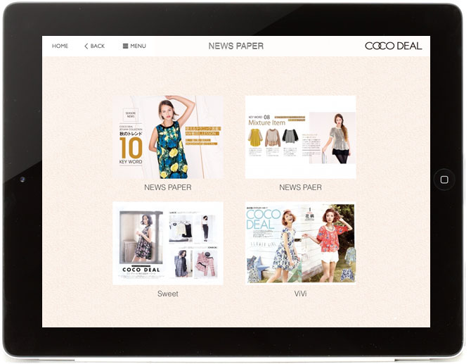 店舗にて、桐谷さんの出演されているCM動画や、メイキング動画、COCO DEALのカタログを「Hi Standard」アプリにて閲覧できます。