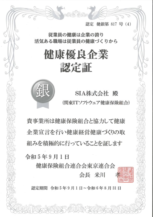 社員とその家族の健康づくりへの取り組みとして行っている健康企業宣言の「銀の認定」の更新を行いました。