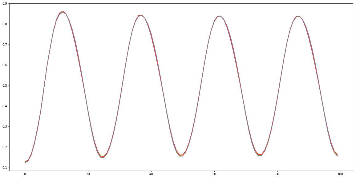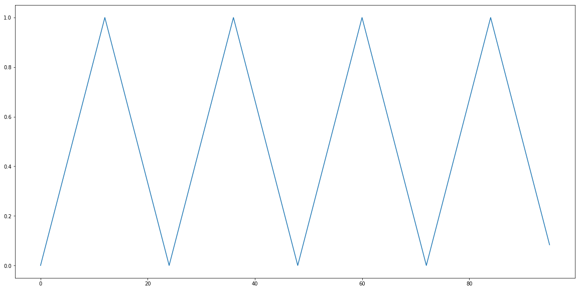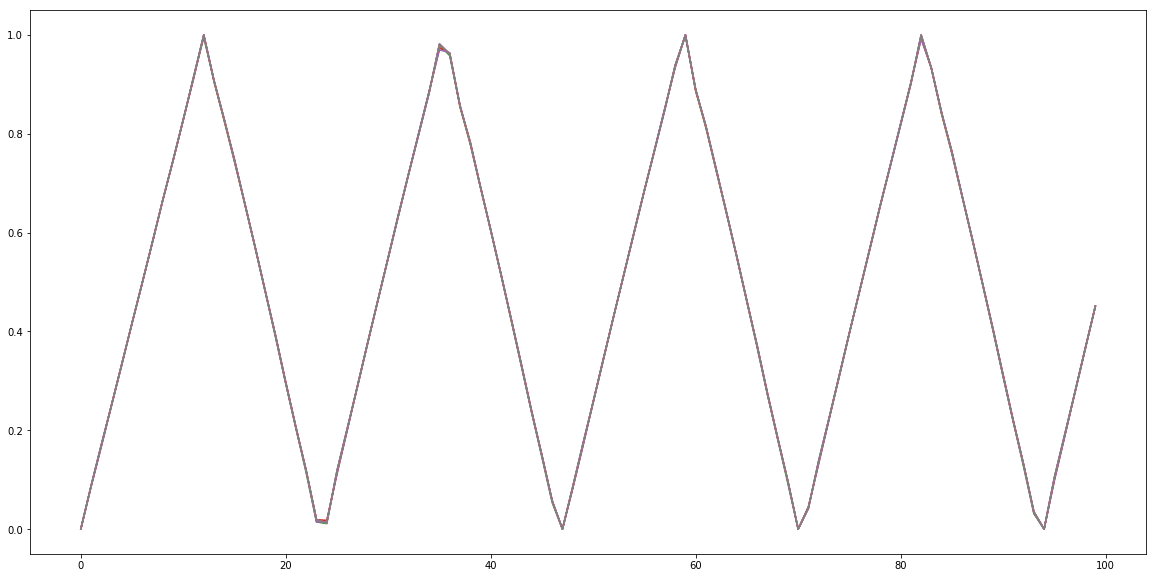 規則性のあるデータを学習させているため、思いとしては「期待するチャート型」のように12周期で値が0から12、12から0と推移し、頂点も鋭角の誤差の無いチャートを期待します。