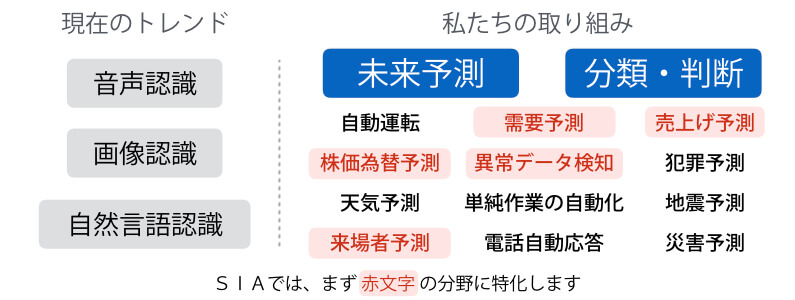 SIA がターゲットとするAI分野は「時系列未来予測、分類、判断」