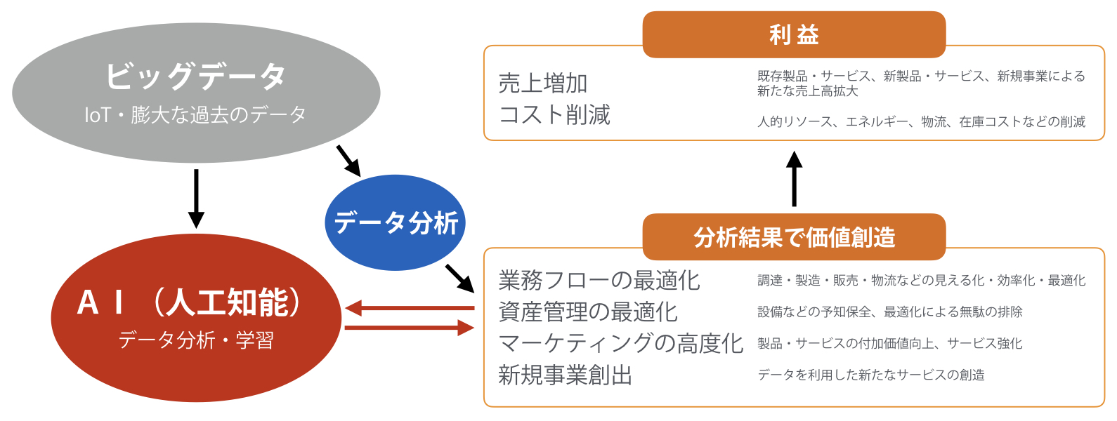 AIはあらゆる産業で利用されていますが、「データ分析」でも、多くの場面で利用されています。例えば、売上高の拡大やコスト削減を通じ利益を増やし、企業価値を高める、というようなことが期待されています。AIというと、何でも屋さんというイメージもあるかと思いますが、実際は「分析屋さん」というイメージの方が正しいかもしれません。しかし、この「分析屋さん」は、闇雲にデータをいれたり、データを読み込ませれば良いというモノではありません。利用するデータや求めたい結果により、ニューラルネットワークには向き不向きがあります。データアナリストなど、機械学習の知見をもったエンジニアが、お客様のデータ、求めたい結果や、どのように生かすかをお聞きし、それらに向いたニューラルネットワーク(=AI)を構築、試行錯誤を行います。私たちは、これらのお手伝いし、業務の円滑化、スマート化や新しいビジネスの創造をお手伝いさせていただきます。結果、皆様の事業が利益を少しでも多く生み出すことや、お客様がさらに喜ばれるサービス提供へとつながることを期待いたします。