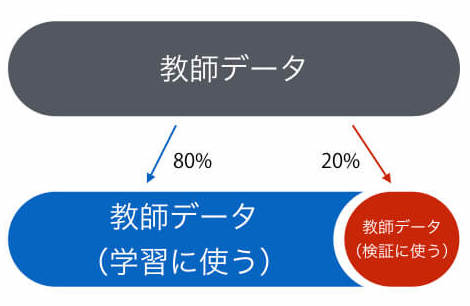 さて、「誤差の少ない」というのはどのようなことか?と申しますと、先ほどの「教師データ」を学習用の80%と、検証用の20%に分割し(割合は自由です)この20%のデータをつかう「予測」をし、データと予測値の誤差を算出します。「本当の」未知のデータでの予測値の有用性は未来のことでわかりませんので、この検証用の20%のデータの誤差数値でモデルの評価を行うしかありません。(教師データ以外に、実データがある場合は、そのデータも利用できます)