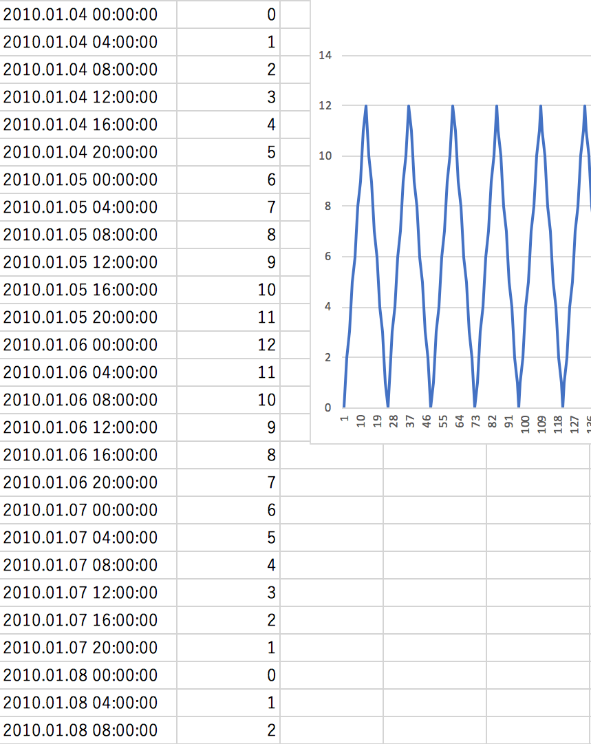 次の図のように「0から12、12から0」を繰り返す「教師データ」を用意します。日付列がありますが、この例では利用しません。