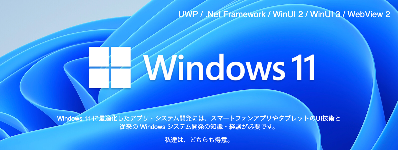 かねてより、日本で発売されるか疑問視されていた Windows Phone アプリ開発にいち早く目を付けた弊社。もちろん Windows 8 、Windows 10 、 Windows 11のアプリ開発も視野に入れておりました。Windows Phone は日本国内では販売されていないこともあり、受託開発でお手伝いさせて頂く事は皆無に近い状態でしたが、他社より早く、新UI、 Modern UI 技術に慣れておくことができたおかげで、現在、多くのアプリ開発のご相談に対して的確かつ柔軟にお応えできていると考えております。